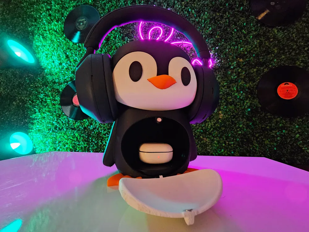 Stylowy stojak na słuchawki w kształcie pingwina z funkcją ładowania bezprzewodowego. Posiada przegrodę na akcesoria i etui ładujące, idealny do przechowywania słuchawek w elegancki sposób.